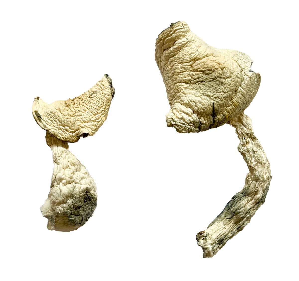 The Jack Frost shrooms are characterized by all white caps that tend to be flat with blueish gills underneath and all white stems. The caps tend to be medium to large and stems are medium thickness. Prior to harvesting these are one of the most beautiful and unique mushrooms we’ve seen. When Jack Frost dries, the bluish gills are harder to observe but the mushrooms will have some blue bruising. The bruising does not effect potency.