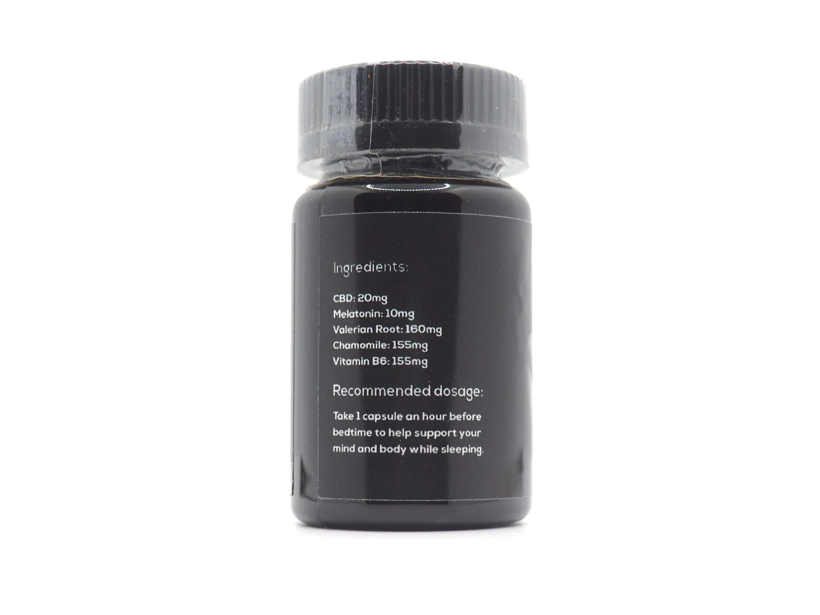 Each bottle contains 30 capsules. Each capsule is 500mg (CBD 20mg, Melatonin 10mg, Valerian Root 160mg, Chamomile 155mg, Vitamin B6 155mg).