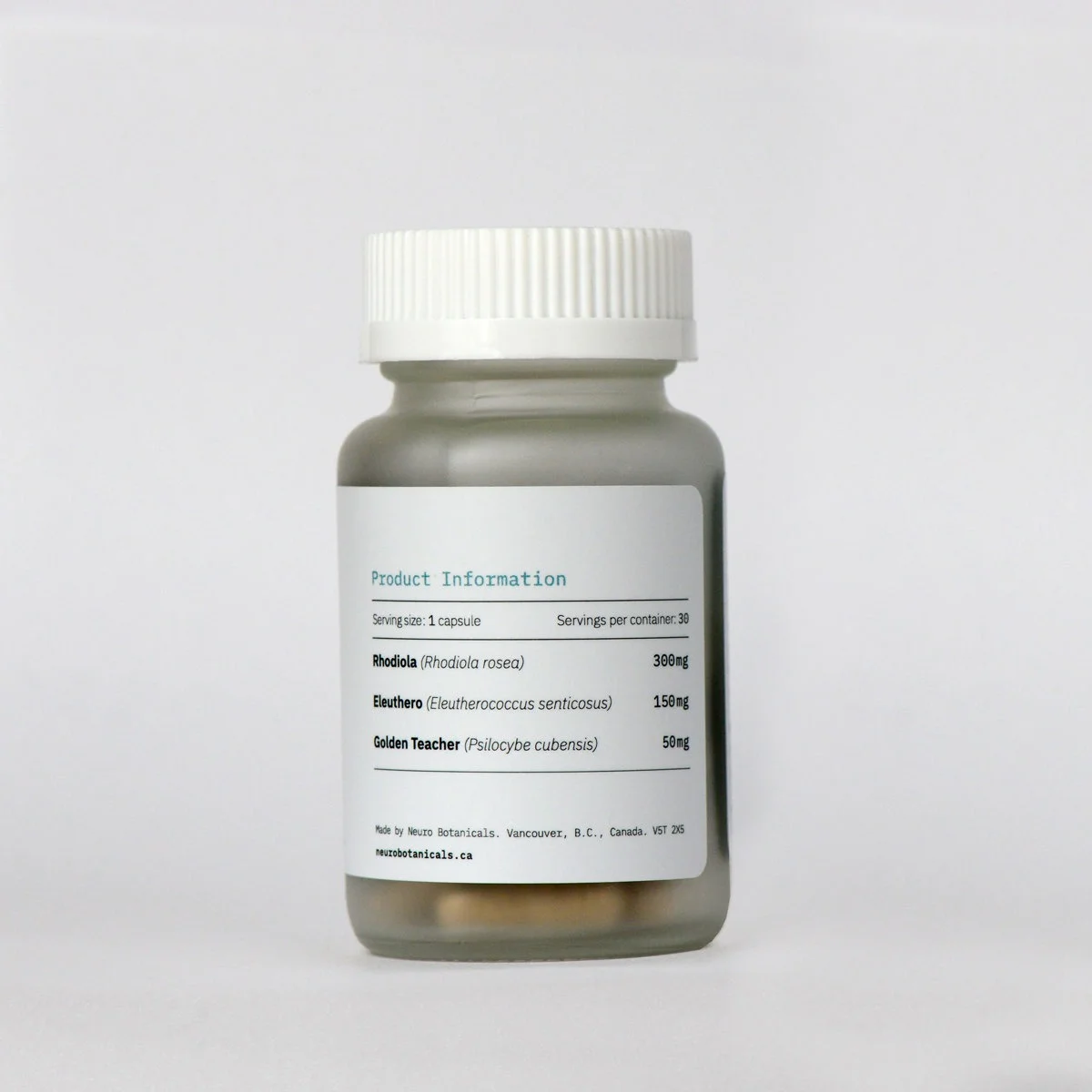 Ingredients: Golden Teacher mushrooms (Psilocybe Cubensis), Rhodiola (Rhodiola Rosea), and Eleuthero (Eleutherococcus Senticosus)